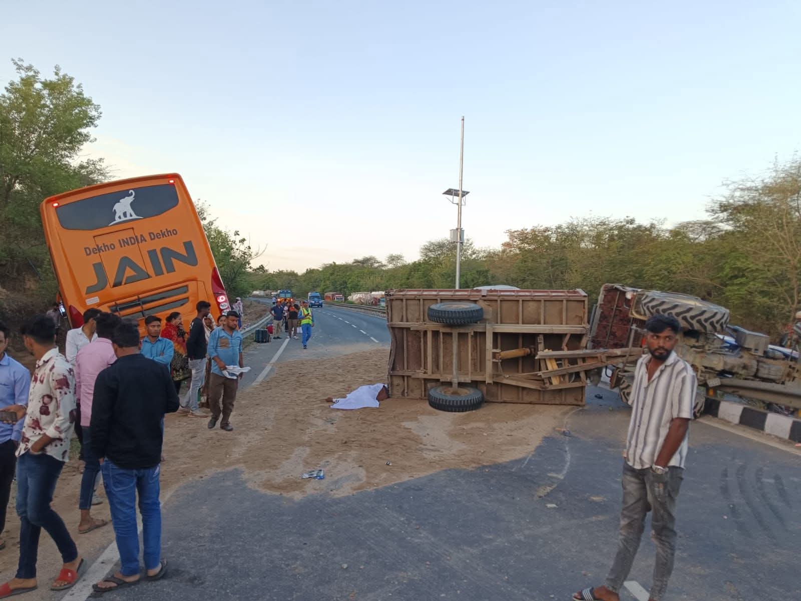 લકઝરીની ટક્કરે ટેકટર અને ટ્રોલી રોડ વચ્ચે આવી જતા ટ્રાફિક જામ સર્જાયો