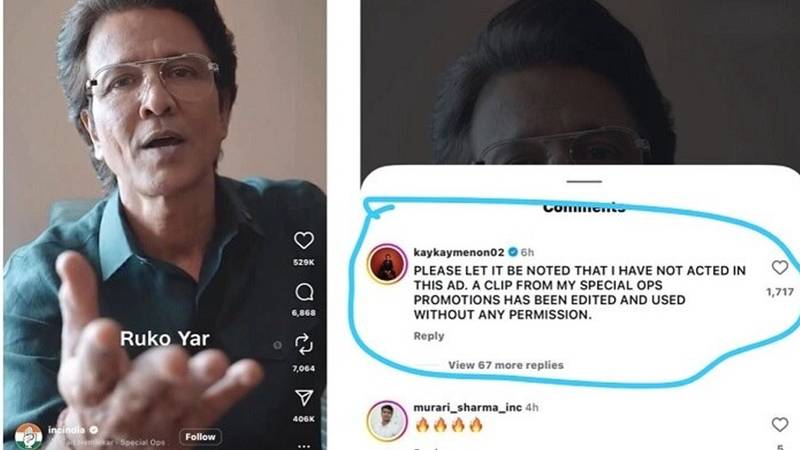 કેકે મેનને લખ્યું, “કૃપા કરીને નોંધ લો કે મેં આ જાહેરાતમાં અભિનય કર્યો નથી. મારી સ્પેશિયલ ઓપ્સ પ્રમોશનલ ક્લિપને પરવાનગી વિના એડિટ કરીને ઉપયોગમાં લેવામાં આવી છે.” અભિનેતાના આ ઇનકાર પર યુઝર્સે મિક્ષ પ્રતિક્રિયાઓ આપી રહ્યા છે.