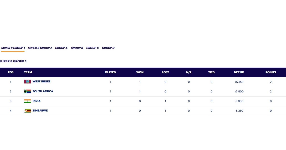 ભારત માટે ચિંતાજનક બાબત એ છે કે દક્ષિણ આફ્રિકા સામેની પહેલી મેચમાં 76 રનની હારને કારણે ટીમનો નેટ રન રેટ -3.8 સુધી ઘટ્યો છે. ઝિમ્બાબ્વે 107 રને હારતા ભારતથી નીચે છે,